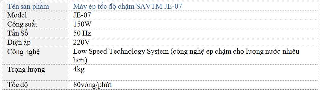 Máy ép trái cây tốc độ chậm SAVTM JE-07 là sự lựa chọn hoàn hảo, sử dụng công nghệ ép chậm cho lượng nước trái cây nhiều hơn gấp 1,5 lần so với máy thông thường, có thể ép liên tục 20 phút, cốc ép của máy an toàn, không độc hại và dễ vệ sinh.