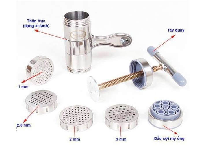 - Thiết kế như một ống xi-lanh thông dụng, có 2 đầu cho ra bún tròn và sợi mì dẹp, dài đều.