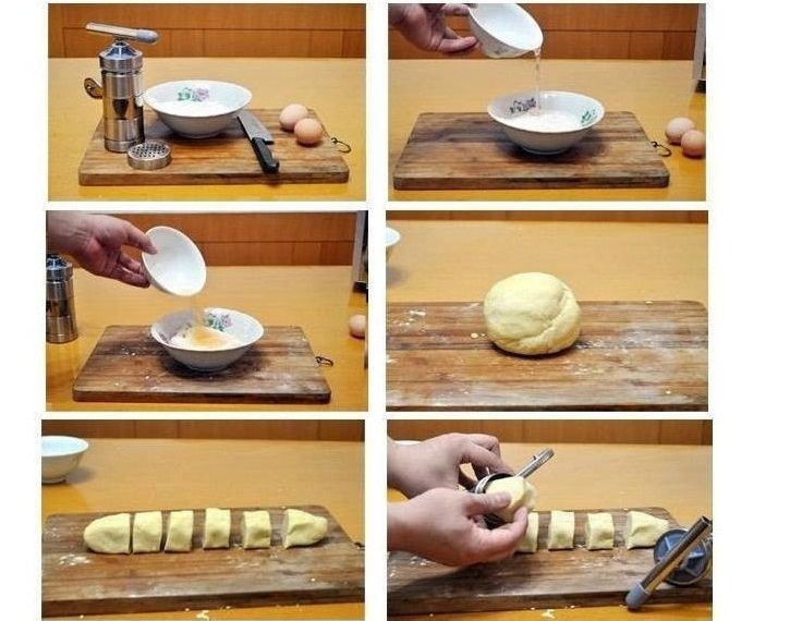 B4: Cho vào khuôn, từ từ xoáy tay nắm là bạn đã có được những sợi mì trứng tươi ngon ngay tại nhà.
