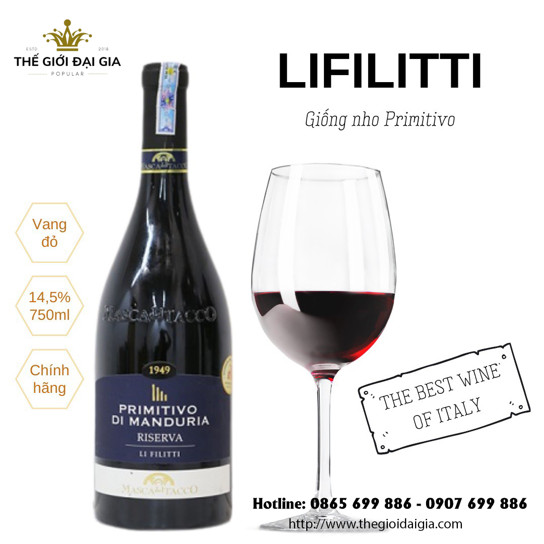 Rượu vang Li “Filitti” được sản xuất từ những quả nho tốt nhất trên những cây nho cổ cũ kĩ và nguyên thủy từ đó loại rượu này thu được với những tinh túy nhất của vùng đất này, cùng sự tinh tế của thời đại mới mà ta cảm nhận được một phong cách rượu sáng tạo mà tôn trọng truyền thống. Rượu vang Li Filitti Primitivo di Manduria là một chai vang xuất sắc từ Puglia, đại diện cho phong cách rượu vang Ý hiện đại: sáng tạo mà vẫn giữ trọn hương vị truyền thống.